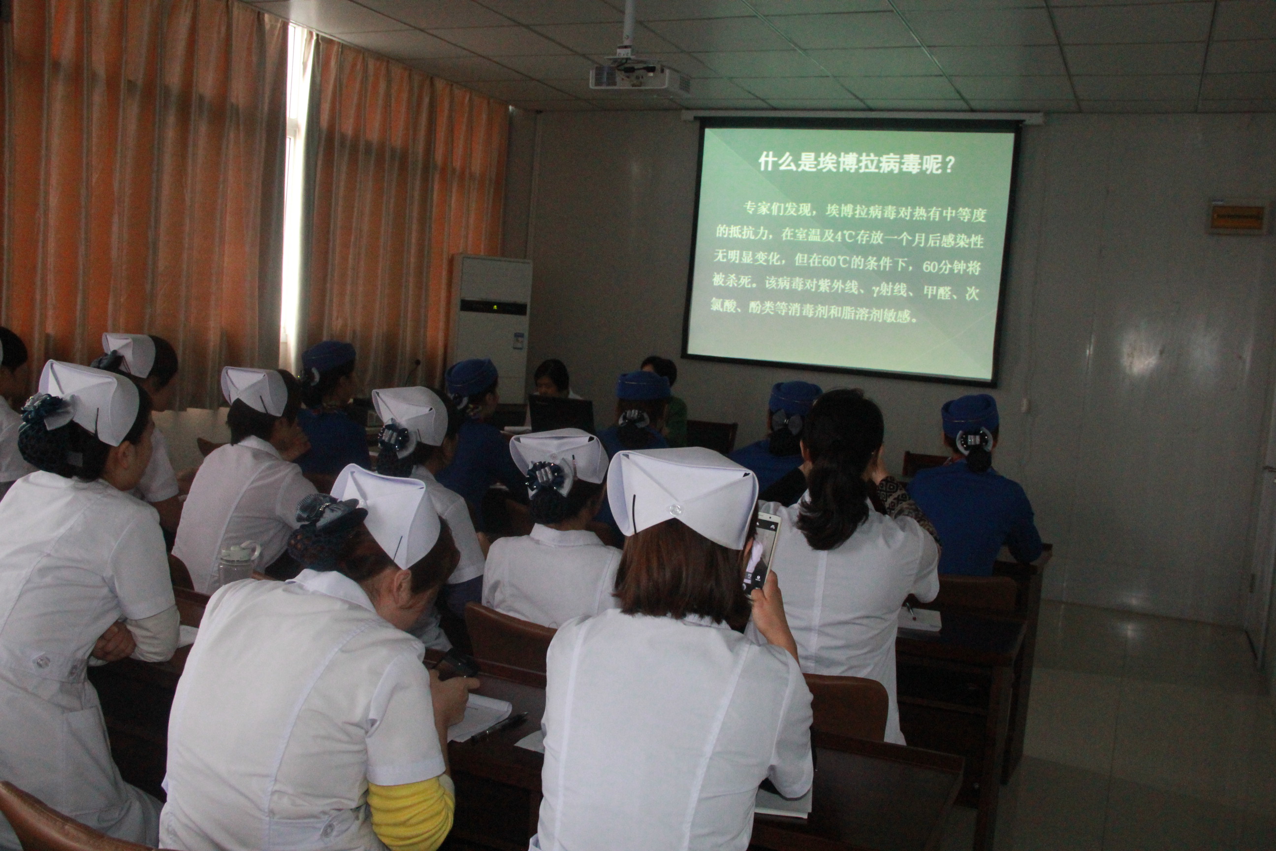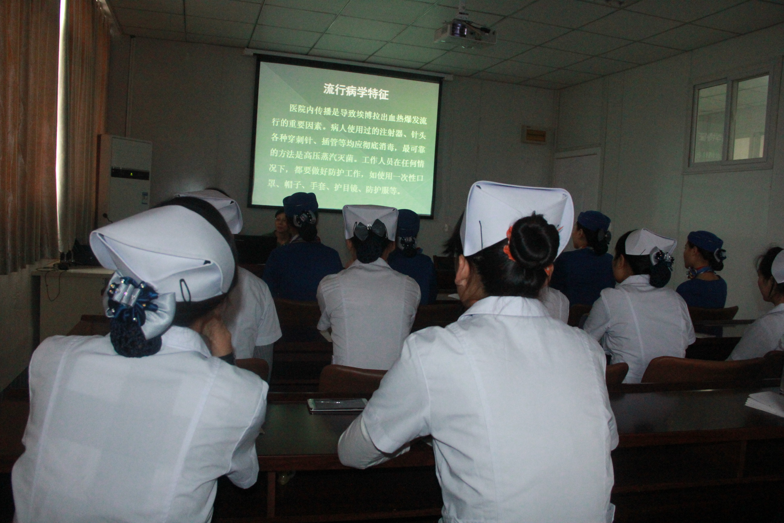 在当天的培训课上,护理部主任李萍以多媒体演示课件的形式,向在座的全体医护人员讲解了埃博拉出血热病原学特征、传播途径、预防控制措施、个人防护等方面内容,全面介绍了埃博拉病毒及其危害。让医务人员全面掌握了对埃博拉病毒识别敏感性及相关知识。